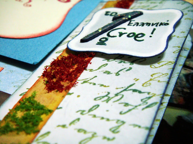 This layout is about the first greek crop that took place in November. I wanted to create a colorful and vibrant page and I think I accomplished it! After adhering the photos and the cards that I made that day as well as some memorabilia, there was no room left, so I folded a piece of paper in two and used the inside for my journaling. I embellished the front of the card with distress inks, the Hero Arts "Old Letter" stamp and then I used a strip of a patterned paper where I added some Flower Soft. Then I added the label, I cut it using a Label One die (Nestabillities) and finally adhered the date and...ready!